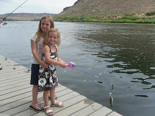I love Travis because he is so selfless. On his day off, he wanted to go sit in 95 degree weather and fish with the kids. Since I'm big on "family activities", I went too even though I really wanted to stay home and rest after working all morning. We drove out to celebration park about 25-30 minutes away and finally found the park tucked down in this canyon. The kids ran around chasing lizards while I wiped away pools of sweat from my body. Trav set up the chairs and fishing polls while I watched the kids frantically chase ugly creatures around in the dirt. I noticed that one of the docks was empty, so the kids and I walked over to claim it. Just as all 5 of us were about to step on the dock and set up camp, a man yelled out, "Hey, there's a rattle snake over there." " Uh, thanks" I yelled back. Come on, really? I thought. I mean I knew we were in a canyon out in the middle of no where in almost 100 degree weather, but really, a snake that would want my kids for lunch? I quickly gathered all my little hens and got the heck out of that area! We went back to where Trav was and fished for a hour, but it was terribly hot. Tristin put in line in and literally 2 seconds later, he had a fish- it was so amazing! Grace caught one too and it was adorable to watch her sitting there with her pink fishing poll and then get all excited when she pulled it out of the water. We had a great time even though we were all exausted from the heat. We ate ice cream cones on the way home and made another memory as a family!