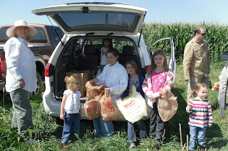 Almost every year we have the oppertunity to go to my sister-in-laws house to pick corn! We love Aunt Cammy & Uncle Ben and they are ALWAYS so sweet to let us stay, pick, play and have fun. They only live 2 1/2 hours away so it really isn't too bad of a drive. We left Friday at 4:00 PM and came home last night at 11:00 PM. The kids had a blast playing with their cousins and the kitties! Grace was in Heaven and literally held a cat 75% of the time we were there. They love being in the country because they get every thing I deny them: Dirt & animals! We had a great time too. Cammy helped me do 30 bags of freezer corn so the next few days I'll be busy trying to double that if not more. Thanks Aunt Cammy & Uncle Ben!